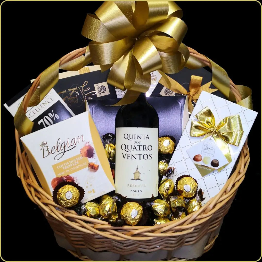 Sadrži portugalsko crveno vino, brendirane bombonjere i praline (Lindt, Premier, Excelcium), Ferrero, Zaini, Lio, i zlatno aranžiranu pletenu korpu.