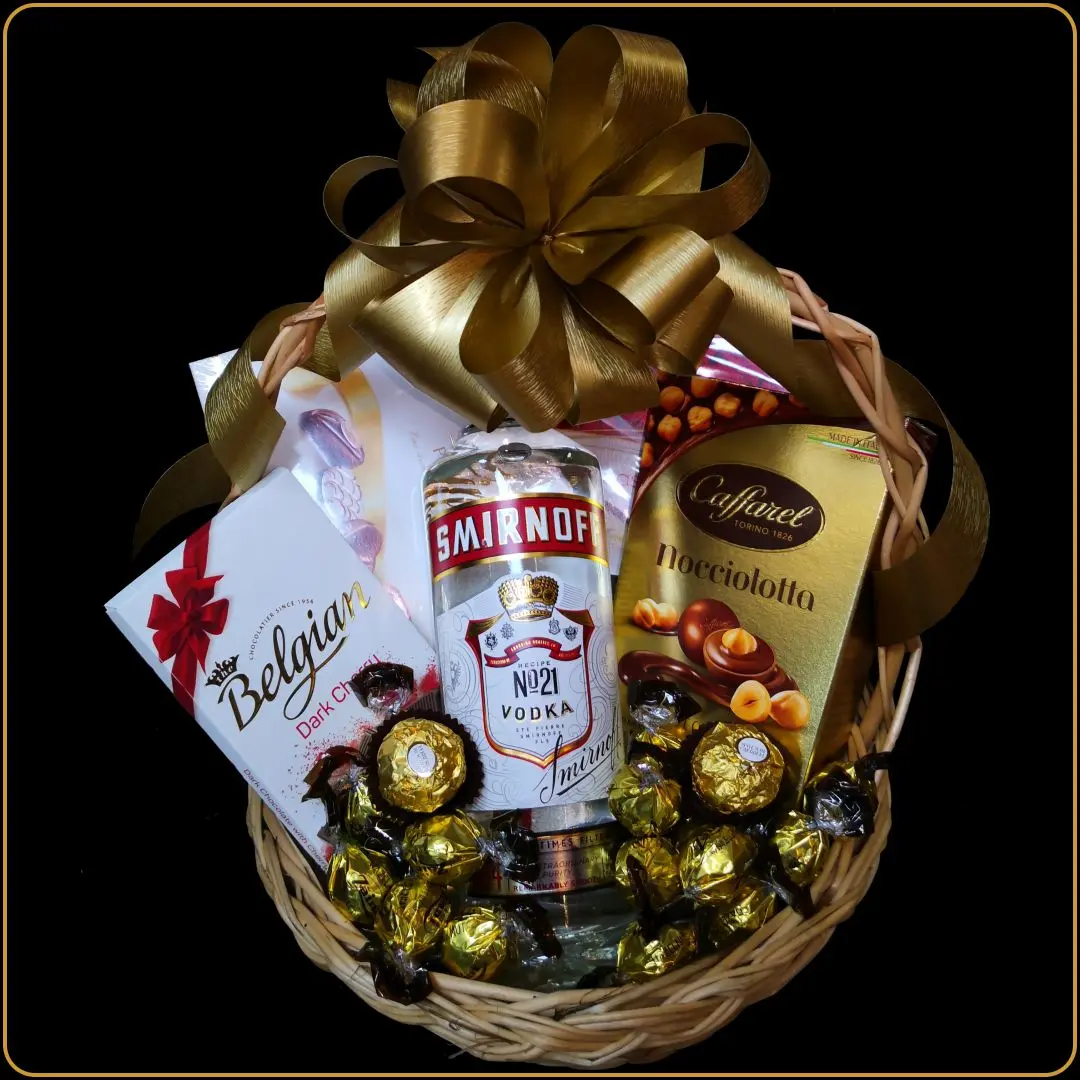Votka Smirnoff Red Label poznata je širom sveta po svojoj čistoći, oštrom ukusu i dugoj tradiciji. Savršeno balansira sa bogatstvom čokoladnih nota koje ovu korpu čine nezaboravnom. Ako tražite originalan poklon za muškarca, ova korpa je pravi izbor. Preporučujemo da pogledate i poklon setove sa alkoholom sličnog stila i vrednosti.