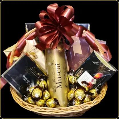 U svom središtu krije elegantno belo vino Muscat D’or, okruženo izborom vrhunskih pralina i čokoladnih klasika koji čine svaki trenutak svečanim. Ova korpa nije samo lep poklon – ona je iskustvo koje poklanjate. Za rođendan, 8. mart, ili jednostavno – zato što neko zaslužuje.