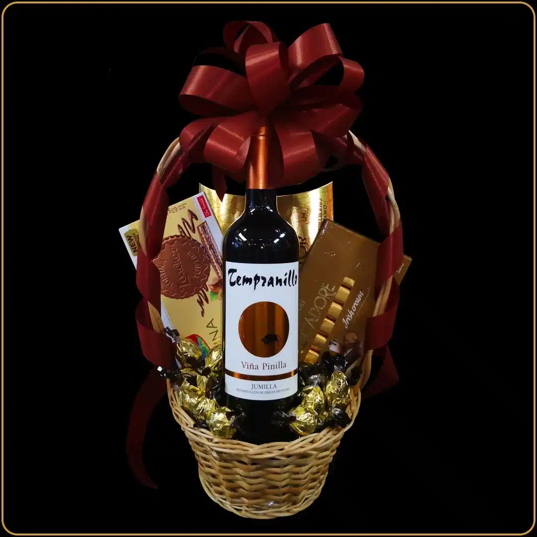 Iako je skromnija po veličini, ova korpa ne oskudeva u emociji ni ukusu. Špansko crveno vino Tempranillo donosi note zrelog voća i blagu začinsku toplinu, dok slatkiši pažljivo balansiraju ceo doživljaj.