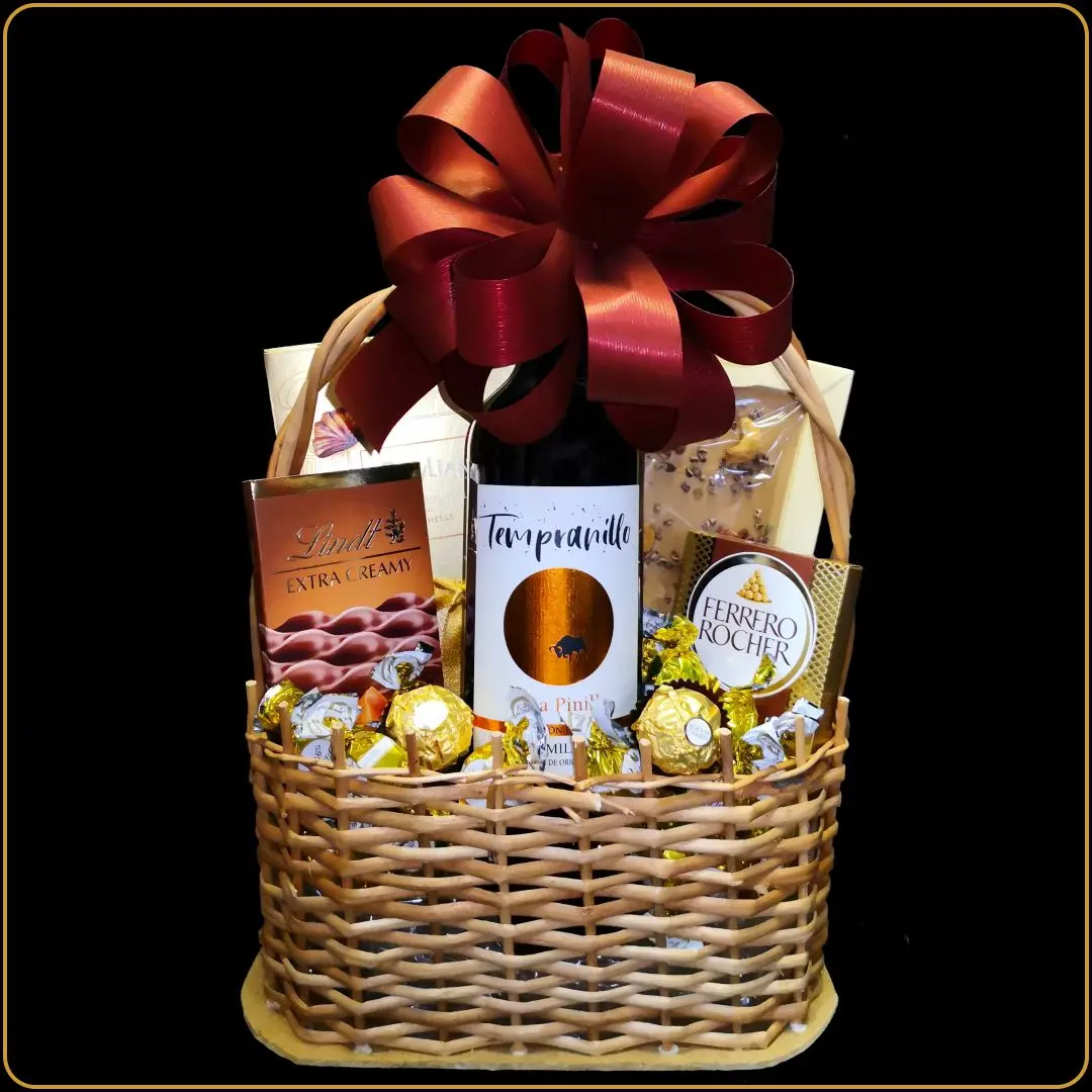 Glavni akcenat je na crvenom vinu Tempranillo, koje se savršeno uklapa uz fine čokolade. Ako tražite poklon sa vinom za ženu ili muškarca, ova korpa je pravi izbor.
