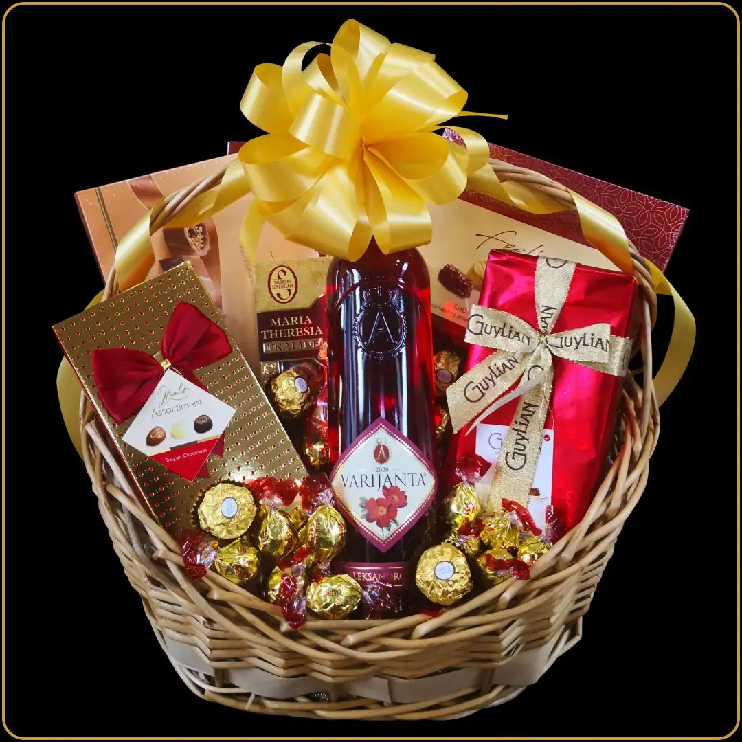 Neke žene vole klasiku, druge vole romantiku. A one koje znaju šta žele – vole poklon korpa Varijanta. Ova elegantna korpa pažljivo je aranžirana u crveno-zlatnim tonovima, sa roze vinom domaćeg porekla i raskošnim izborom najkvalitetnijih evropskih čokolada. Idealna je kao poklon za devojku, pažljiv gest za prijateljicu ili iznenađenje koje govori više od reči.