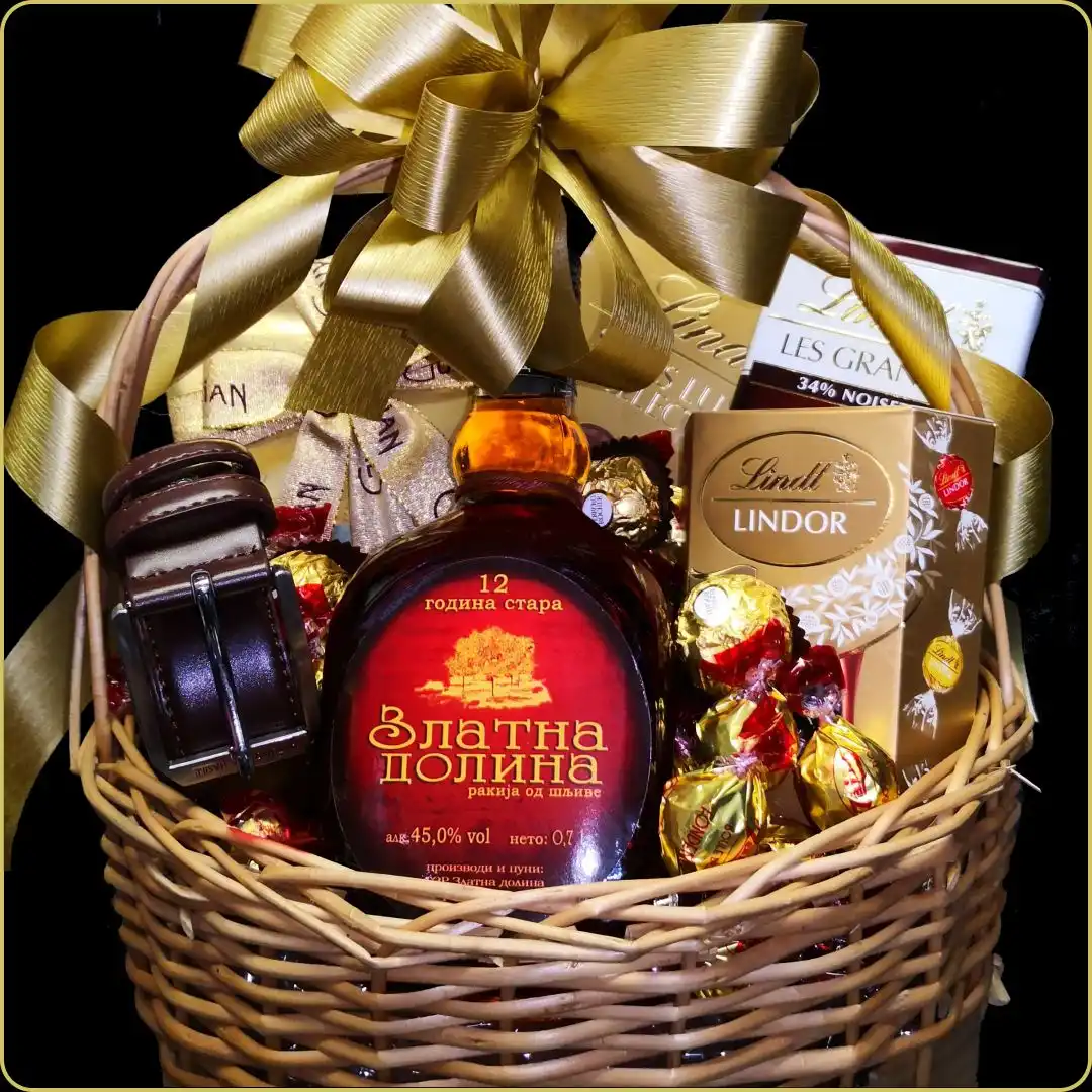 Srce ove poklon korpe je šljivovica Zlatna Dolina, stara čak 12 godina. Potiče iz tradicionalne proizvodnje, sa pažljivo čuvanom recepturom i jačinom od 45%. U elegantnoj flaši tamnog stakla, ovo je luksuzan poklon za svakog muškarca koji zna da uživa u domaćim vrednostima i moćnom ukusu.