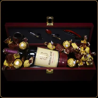 Poklon kutija sa vinom je pažljivo kreiran komplet za ljubitelje vina, savršen kao poslovni poklon, poklon za prijatelja ili poklon za rođendan za muškarca. Luksuzna drvena kutija sa srpskim crvenim vinom Kovačević i pažljivo biranim čokoladama oduševljava na prvi pogled i gutljaj. Kombinacija prestiža, ukusa i korisnog vinskog pribora.