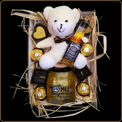 U gajbici se nalazi mala boca Jack Daniel’s Tennessee viskija, domaći bagremov med u saću, plišani meda koji šarmira svojim izgledom, mirisne sveće u obliku srca i Ferrero kuglice. Sve je pažljivo upakovano u prirodnu rafiju, sa celofanom i satenskom mašnom – spremno za poklanjanje bez ikakve dodatne pripreme.