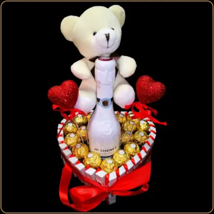 Ovaj slatki poklon deo je kolekcije slatkih poklona bez alkohola i ljubavnih poklona za žene, a svojom kombinacijom čokolade, plišane igračke i penušavog vina, sjajno se uklapa i uz korpe sa plišanim igračkama. Ova univerzalnost čini ga odličnim izborom za više prilika.