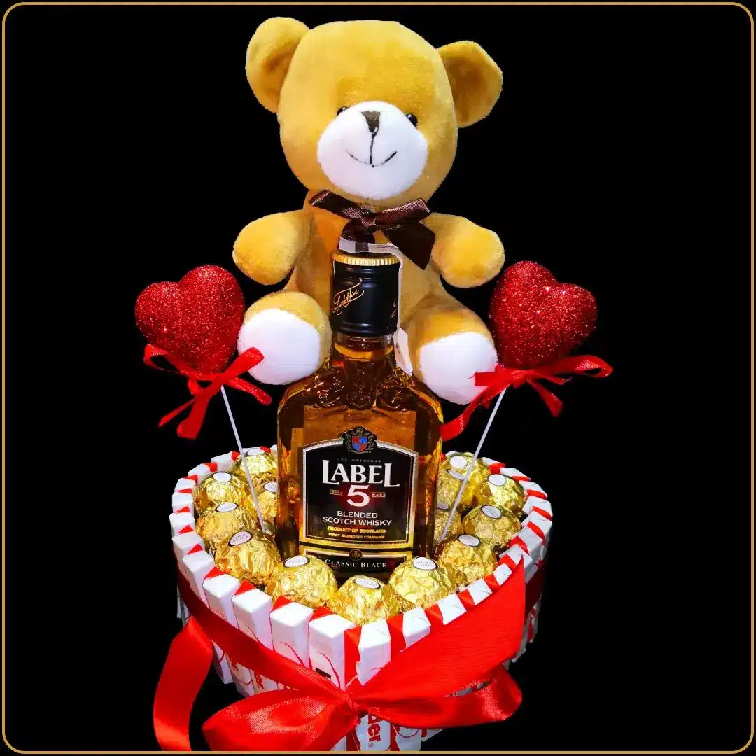 Set sadrži Kinder čokolade (390 g), Ferrero kugle (250 g), viski Label 5 0,2 l, plišanog medu, 2 srca-pika i dekoraciju.
