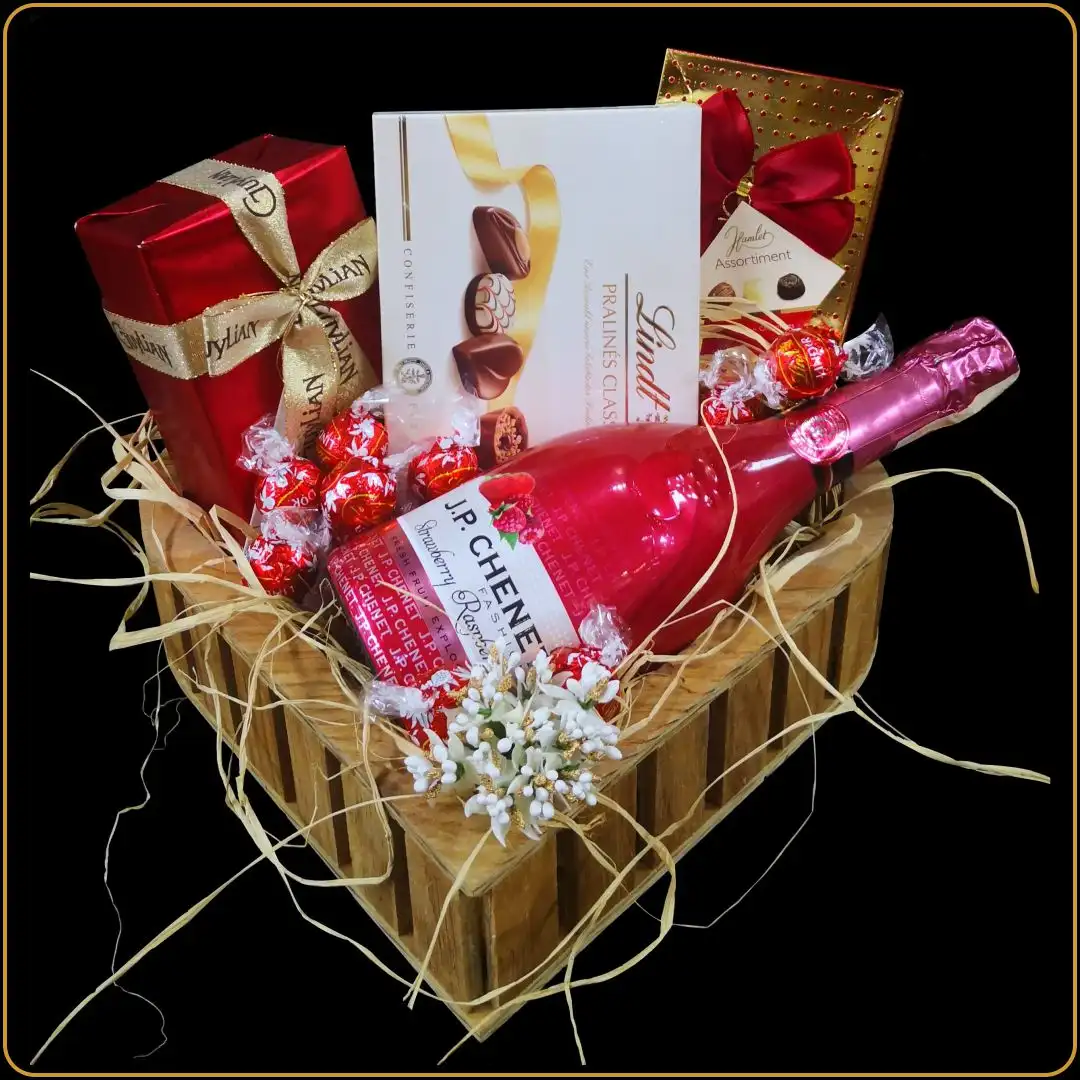 Ovaj poklon spada u viši cenovni rang, ali njegova vrednost prevazilazi samu cenu: renomirani brendovi čokolada, elegantno penušavo vino, ručno aranžirana gajbica u obliku srca i pažljivo upakovani detalji čine ga nezaboravnim poklonom.