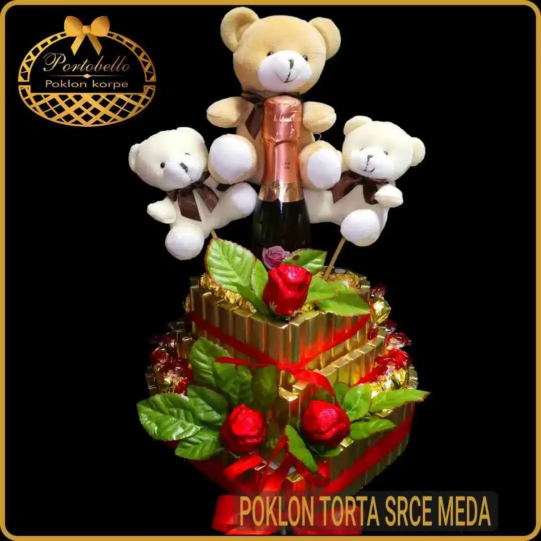 Poklon torta Srce meda je slatki poklon za devojku. Mali šampanjac, plišane mede, čokoladne ruže, i puno čokoladica, aranžirani u prelepoj torti u obliku srca, daju jedan jedinstven poklon za devojku. Originalan poklon za zaljubljenje ili upečatljiv poklon devojci za rodjendan. Nijedna devojka neće ostati ravnodušna, kada primi ovakav poklon ljubavi.