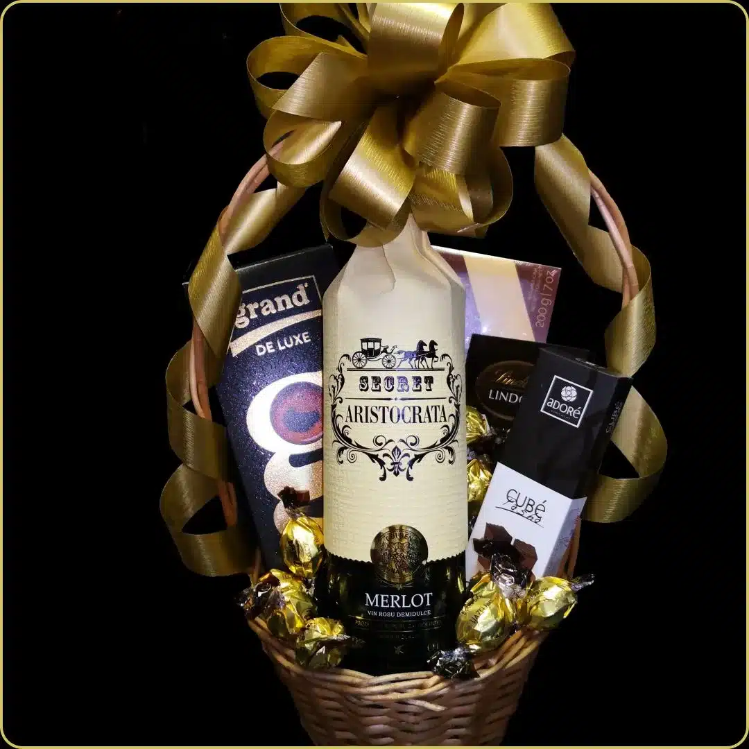 U srcu korpe nalazi se Aristocrata Merlot – crveno vino iz Moldavije koje odiše bogatstvom ukusa i dubinom tradicije. Idealno se uklapa u slavsku atmosferu, uz slavski ručak i iskrene razgovore. Ovaj poklon se posebno preporučuje i u okviru naših poklona za slavu.
