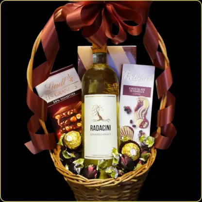 U središtu korpe nalazi se Radacini Chardonnay – suvo belo vino iz Moldavije poznato po izraženim voćnim aromama, nežnoj teksturi i eleganciji. Uz vino, pažljivo su uklopljeni poznati evropski brendovi slatkiša:
