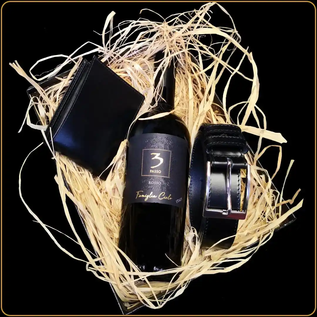 U okviru poklon seta vino funkcioniše kao centralni element, dok novčanik i kaiš uvode praktičnu dimenziju. Kompozicija ostaje uravnotežena i funkcionalna za formalne poslovne situacije.