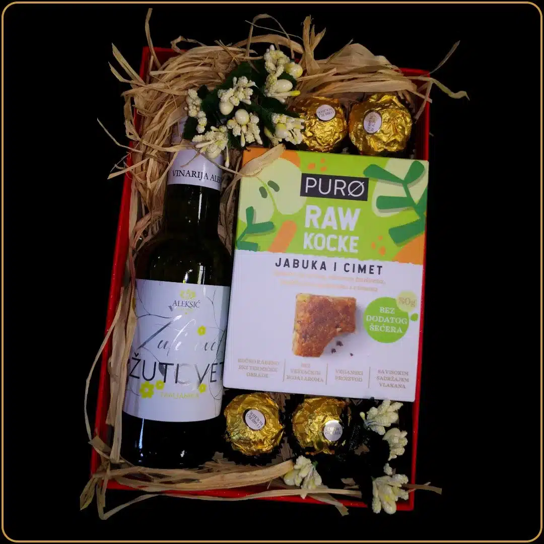 Vino u srcu ovog poklona dolazi iz poznate srpske vinarije, idealno za poklone sa ukusom i stilom. Kombinacija sa raw slatkišima čini ga nežnim i sofisticiranim izborom.