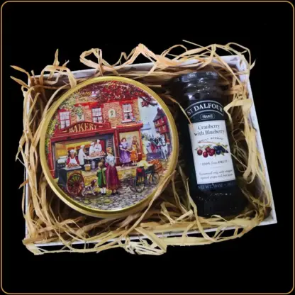 Sadrži Jacobsen danski keks u limenci od 150 g, St. Dalfour francuski džem Brusnica & Borovnica od 284 g, ukrasnu kutiju, rafiju, celofan i mašnu.
