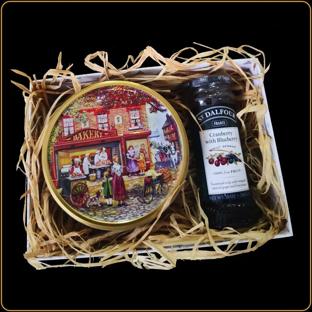 U središtu ove poklon kutije nalaze se vrhunski proizvodi: Jacobsen danski keks poznat po hrskavoj strukturi i vanilastom ukusu, kao i St. Dalfour džem, proizveden od 100% voća bez dodatog šećera, u autentičnoj francuskoj recepturi. Kombinacija je idealna za one koji cene klasičan ukus sa evropskim šarmom.