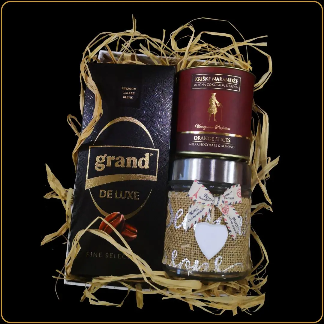 Set sadrži Grand De Luxe kafu (200 g), Eugen čokoladu sa kriškama narandže (120 g), dekorativnu staklenu teglicu, ukrasnu kutiju, celofan, rafiju i mašnu.