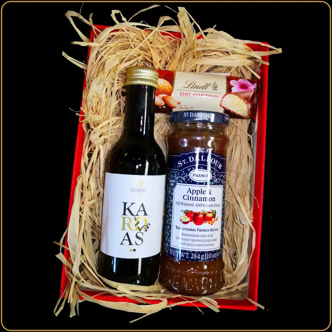 U središtu ovog poklona nalazi se Lindt marcipan – punog ukusa i vrhunskog kvaliteta, uz dodatak džema od jabuke i cimeta po tradicionalnoj francuskoj recepturi. Sve zaokružuje srpsko vino Kardaš, savršeno za opušten trenutak. Za više ovakvih ideja, pogledajte male poklone ili poslovne poklone.