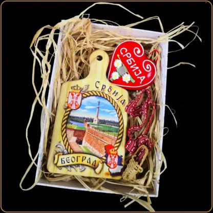 Set sadrži pažljivo odabrane suvenire koji na simboličan način predstavljaju srpsku tradiciju, običaje i lokalnu estetiku. Svaki element u poklon kutiji ima svoju priču: od liciderskog srca, preko minijaturnih opanaka, do suvenira sa slikom Kalemegdana – jedan od najprepoznatljivijih pogleda na Beograd. Spojeni u celinu, ovi predmeti čine idealan poklon sa identitetom.