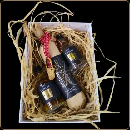 Ono što ovaj poklon čini jedinstvenim jeste spoj tradicionalnih sastojaka i modernog pakovanja. Srpska rakija Troglav – dunja i šljiva – u mini pakovanjima, savršeno se slaže sa ekskluzivnom Premier čokoladnom kobasicom (200g), delikates poslasticom koja iznenađuje svojim oblikom, a oduševljava ukusom. Suvenir opanak kao obeleživač stranica unosi dodatni simbol lokalnog identiteta.