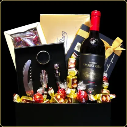 Set za slavu Maestrelle je savršen poklon za slavu, pažljivo osmišljen za muškarce koji vole vino, stil i eleganciju. U elegantnoj crnoj kutiji nalazi se vino iz Toskane, vinski set i vrhunske čokolade – idealan poklon za poslovne partnere i svečane prilike. Ručno aranžiran i spreman za darivanje, bez dodatnih troškova pakovanja.