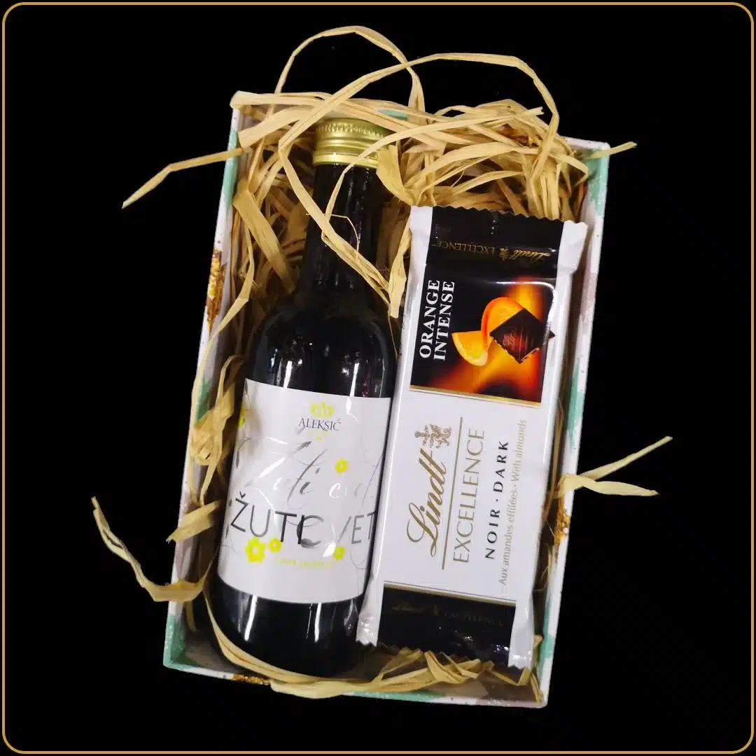 Set Žuti cvet je mali, ali izuzetno promišljen poslovni poklon koji u sebi spaja lagano belo vino iz domaće vinarije i savršeno izbalansiranu tamnu čokoladu sa aromom narandže. Kada želite da ostavite utisak, a pritom ostanete u okviru simbolične vrednosti, ovaj set predstavlja pravi izbor. Idealno rešenje za poklone za zaposlene, koleginice, partnere ili kao zahvalnica saradnicima.