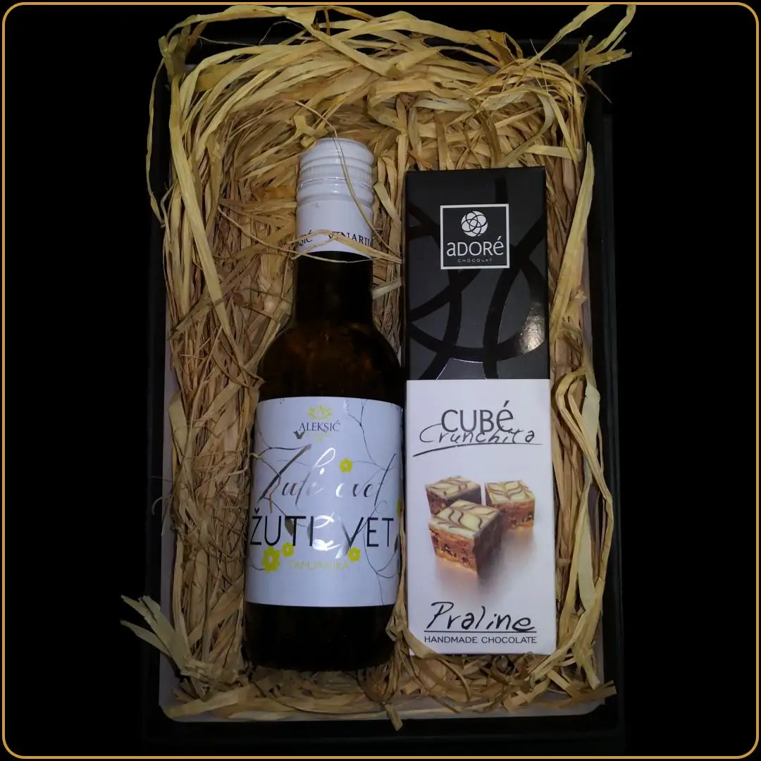 Zaleksić Žuti cvet u mini formatu od 0,187 l predstavlja centralni element seta. Format je prilagođen simboličnom darivanju i omogućava jednostavnu prezentaciju bez dodatnih protokolarnih zahteva.