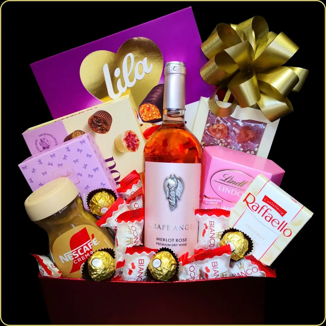 U srcu ovog seta nalazi se Grape Angel Merlot Rosé – nežno, voćno vino koje savršeno pristaje uz ženske slavske poklone. Pored njega, svaki dodatak pažljivo je odabran da bi zadovoljio najrazličitije ukuse: od premium bombonjera do kafe i čokolada koje mame osmeh.