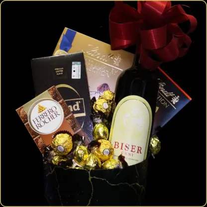 Sadrži vino Biser Crni (0,75l), Grand De Lux kafu, Lindt i Ferrero čokolade, Zaini praline i ukrasnu kutiju sa mašnom.