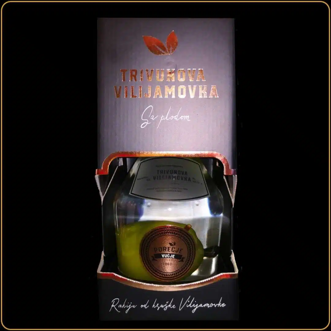 Trivunova Viljamovka sa plodom je jedinstven spoj tradicije i elegancije – autentična rakija od kruške u kojoj se nalazi ceo plod, ručno ubrana viljamovka, zatvorena u prepoznatljivoj staklenoj boci. Ovaj poklon izaziva divljenje i poštovanje, posebno među ljubiteljima jakih pića i srpske rakijske tradicije. Idealna je kao poklon za muškarce, posebno za rođendane, jubileje, ili kao znak pažnje poslovnim partnerima. Ako birate poklon za rođendan koji se pamti, ovo je pravi izbor.