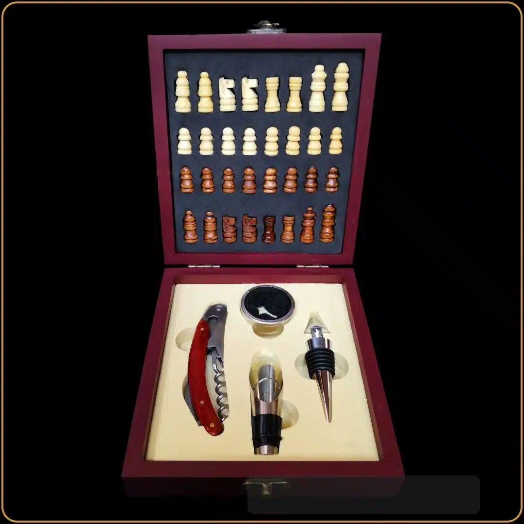Vinski set Šah je savršen spoj funkcionalnosti i zabave – sadrži kompletan set pribora za vino i šahovsku tablu sa figuricama. Namenjen je kao poklon za muškarca, poklon za prijatelja ili poslovni poklon koji ostavlja utisak. Upakovan u elegantnu drvenu kutiju, ovaj set kombinuje strast prema igri sa uživanjem u vinu.